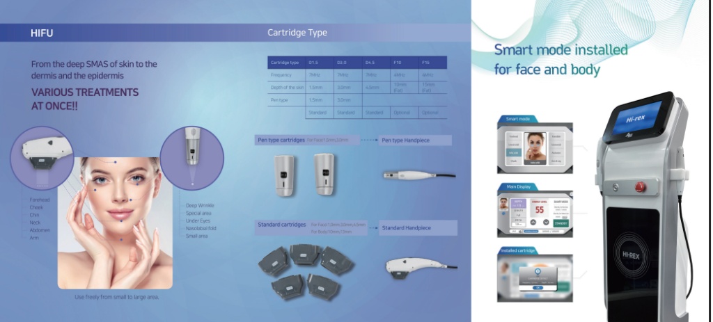 | Cartridge | 7MHz: 1.5mm, 3.0mm, 4.5mm - For Face 4MHz: 10mm, 13mm (option) - For Body & Fat |